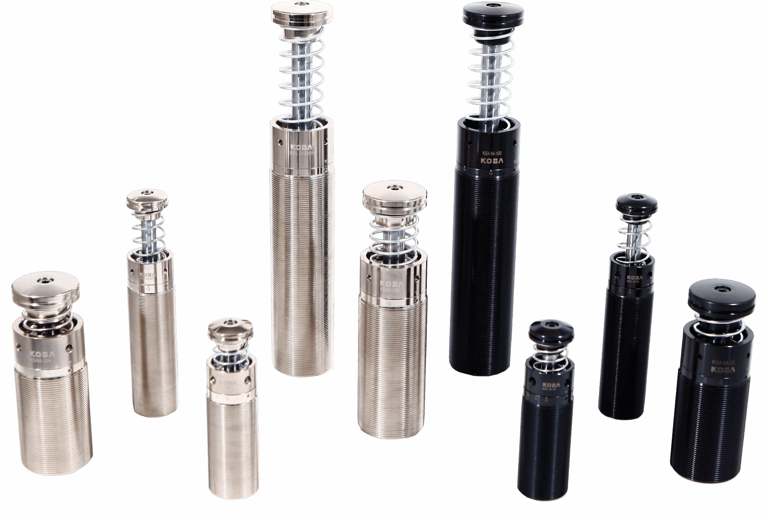 Seria KSA to amortyzatory średnich i dużych rozmiarów, regulacja jest możliwa za pomocą 12-stopniowego pokrętła z przodu i na końcu obudowy. Z przodu znajduje się funkcja ogranicznika regulacji.