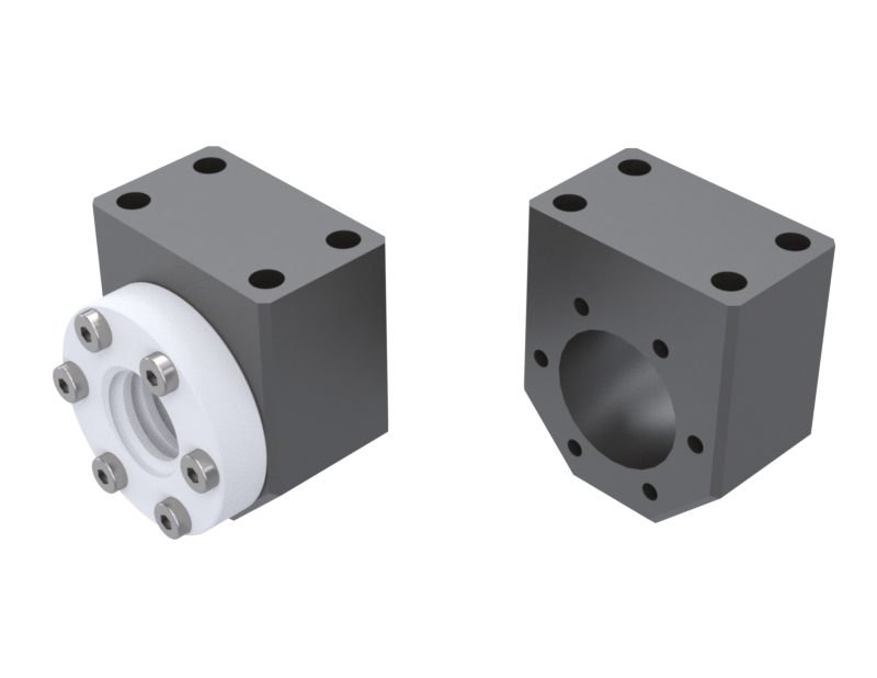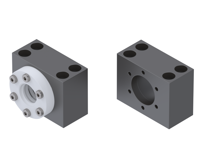 Obudowy do prostopadłego montażu nakrętek trapezowych oraz kulowych wg. normy DIN.