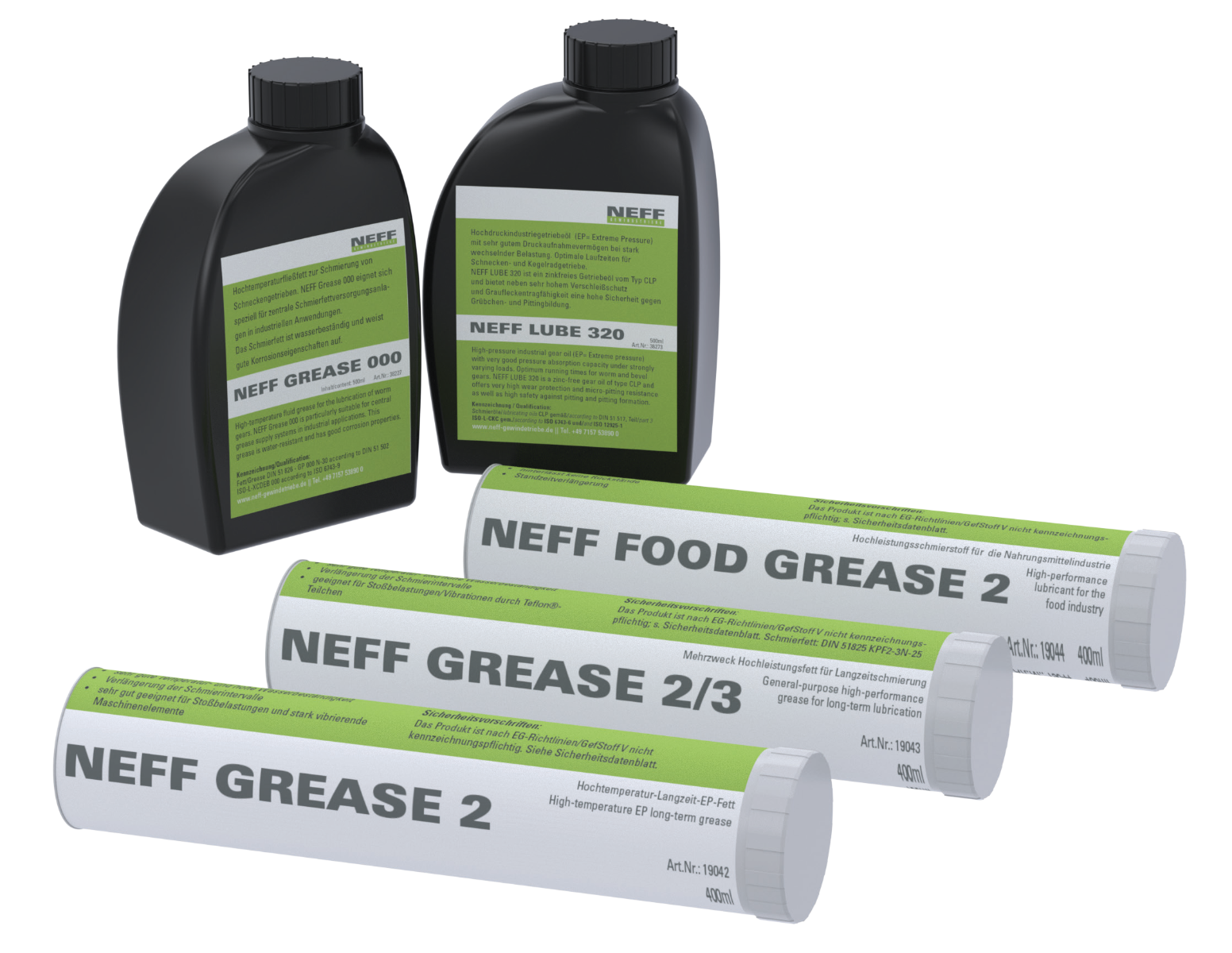 Specjalnie dopasowane smary GREASE 2, GREASE 2/3, FOOD GREASE 2, GREASE 000 i Lube 320 mają zoptymalizowane właściwości, specjalnie dopasowane do gamy produktów NEFF. Należą do nich doskonała ochrona elementów przed zużyciem i korozją, bardzo dobra odporność na temperaturę oraz wysoka wodoodporność. Skutkuje to wyższą wydajnością produktów inżynierii napędowej i wydłużonymi okresami między smarowaniami