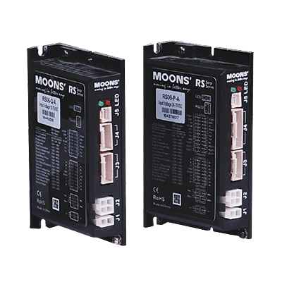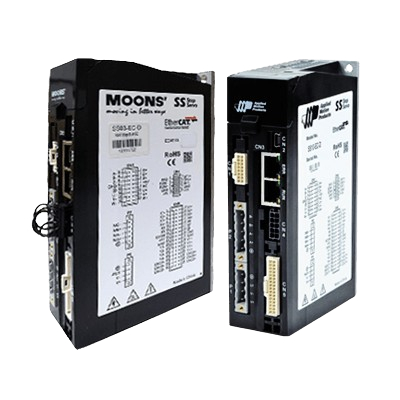 Napędy serwokrokowe marki Moons’ spełnią oczekiwania nawet bardzo wymagających aplikacji. Napęd składa się z silnika krokowego z enkoderem oraz zaawansowanego sterownika, odpowiedzialnego za pracę w zamkniętej pętli sprzężenia zwrotnego. Możliwa jest praca w trybie prędkości, pozycji lub momentu. Silniki wyposażone są w enkoder o dużej rozdzielczości 4096imp./obr. dla serii RS oraz 20000 imp./obr. dla serii SS i SS-EC, co gwarantuje płynną pracę i bardzo dokładne pozycjonowanie. Napędy serwokrokowe pozbawione są wielu wad standardowego silnika krokowego takich jak: gubienie kroków, niska sprawność, nagrzewanie się do wysokich temperatur, rezonanse mechaniczne, itp. Dodatkowo napędy serwokrokowe marki Moons’ oferują szerokie możliwości komunikacyjne, m.in. przez protokoły komunikacyjne Modbus, Ethernet IP, CANopen, EtherCAT, SCL. Na uwagę zasługuje również wbudowany wewnętrzny sterownik ruchu – Q programmer, który umożliwia niezależną pracę napędu. Dzięki czemu w wielu przypadkach można zrezygnować z użycia sterownika nadrzędnego, np. sterownika PLC.