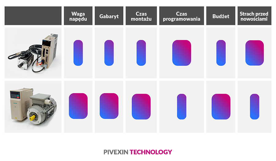 Odpowiadając sobie na te pytania, możemy w prosty sposób określić, którą technologię musimy/możemy wykorzystać. Idąc w kierunku prostszego zestawu, ale droższego? Czy jednak w tańszy budżetowo serwo-napęd, ale bardziej skomplikowany w uruchomieniu.