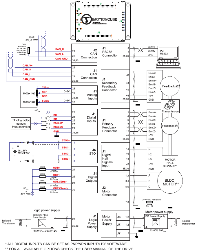 - 4 wejść cyfrowych: 12-36V , PNP/NPN programowalne (2 czujniki krańcowe i 2 wejscia ogólnego użytku)
