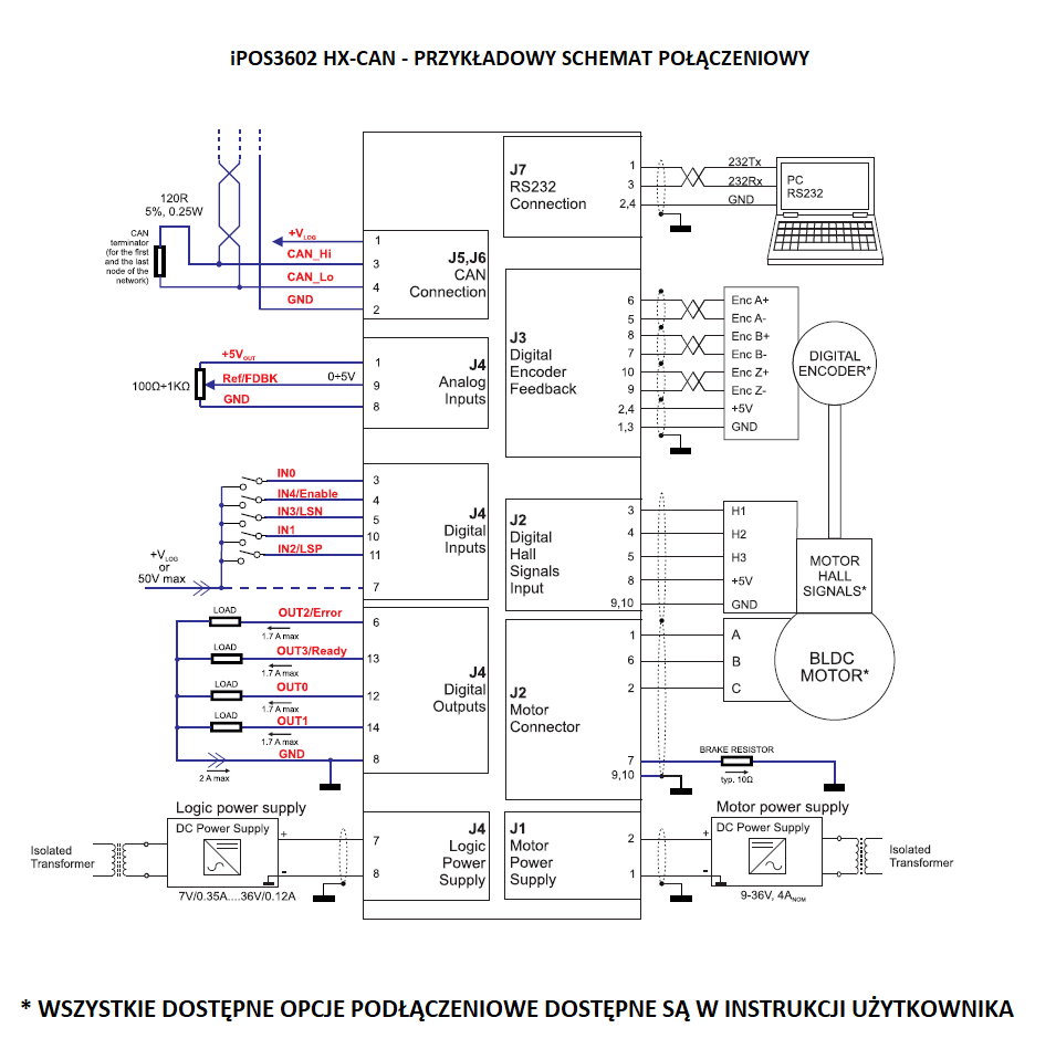 - Komunikacja: RS-232 i CANopen/CAN-Bus
