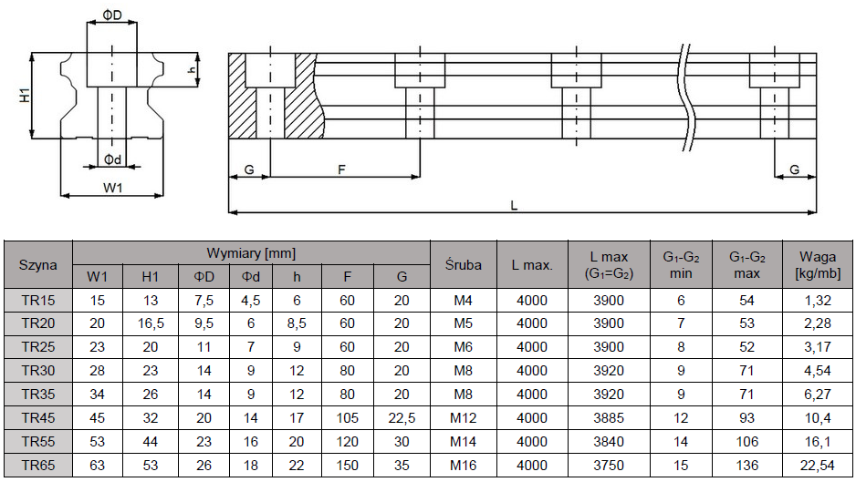 Szyna | Wymiary [mm] | Śruba | L max. | L max (G 1 = G 2 ) | G 1 – G 2 min | G 1 – G 2 max | Waga [kg/mb] | ||||||