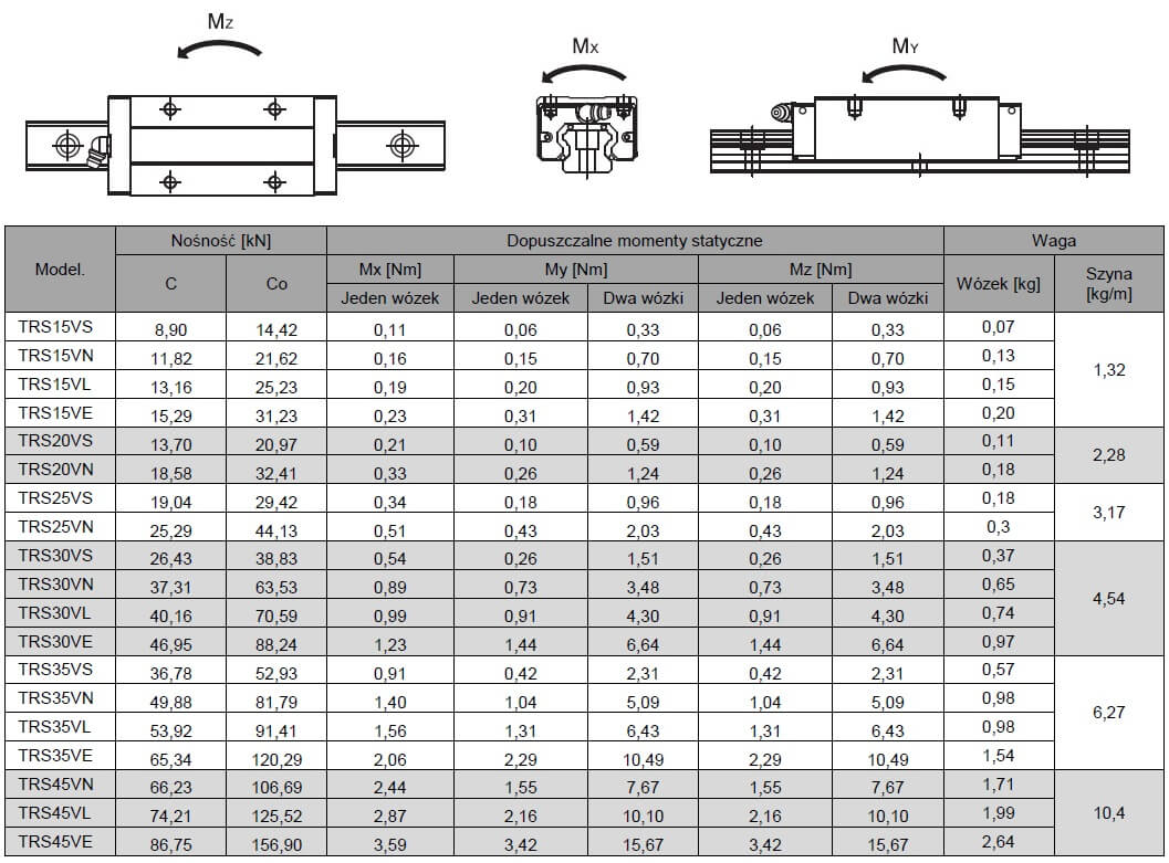 Wózki marki TBI MOTION serii TRH oraz TRS dopasowane są do szyn TR.